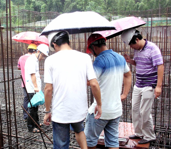 檢查現(xiàn)場鋼筋綁扎質(zhì)量情況
