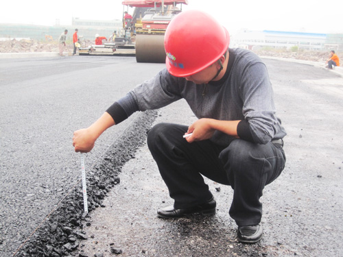 我項(xiàng)目管理人員抽查瀝青攤鋪層厚度