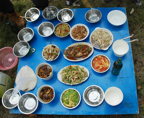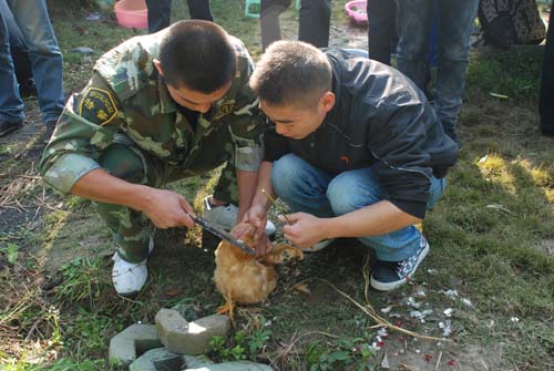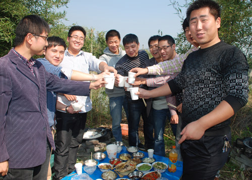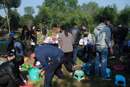 活動前的注意事項剛剛宣布完畢,各組組員就迫不及待地動起手來。這邊,組里僅有的兩個男組員被安排去殺雞。割喉、開水燙、拔毛、洗凈,如此麻利的動作,沒有一點生活經驗的人是無論如何做不到的;那邊,女組員們率領著幾個小家屬開始擇菜,時不時地傳來小組員們咯咯的笑聲。這邊組員吆喝著“第一條魚煎出來啦”,那邊組員不服氣地說要弄個酸菜魚給大家展示展示;這邊組的板栗燒雞剛剛出爐,那邊的白斬雞也快要完工;這邊組的大鍋飯剛剛煮好,那邊已經開始圍成一桌“干”了起來……秋天已經快要枯萎的草地上灑滿燦爛的陽光和歡樂的笑聲,好一派其樂融融的景象。
