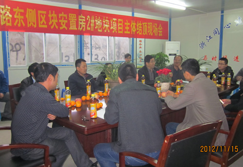 在主體結(jié)頂現(xiàn)場會上,我公司副總經(jīng)理鄭則啟指出:希望全體參建人員再接再厲,繼續(xù)發(fā)揚不怕苦、不怕累的精神。進一步嚴(yán)把質(zhì)量關(guān),加強安全管理,加快施工進度,確保我們這一安置房工程能夠順利竣工交付,早日惠及老百姓,為建設(shè)海寧做出我們應(yīng)有的一份貢獻,給當(dāng)?shù)卣腿嗣窠簧弦环轁M意的答卷?。ê幇仓梅宽椖坎?俞昭 供稿)